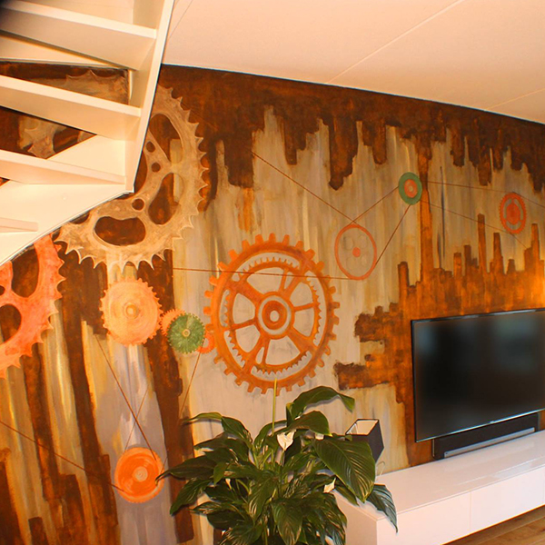 Een grote muurschildering die de gehele muur van de woonkamer bedenkt in Industriële stijl